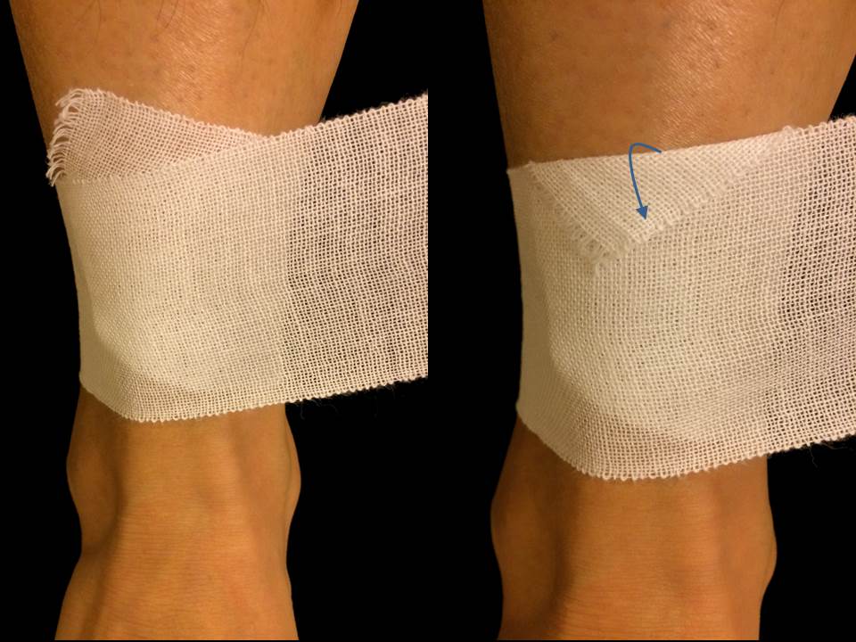 なぜこのような巻き方をするかというと、伸び縮みのしない綿包帯は傾斜の強い部分をまっすぐに巻くと、必ずどこかがきつく締めつけられてしまうからですい。