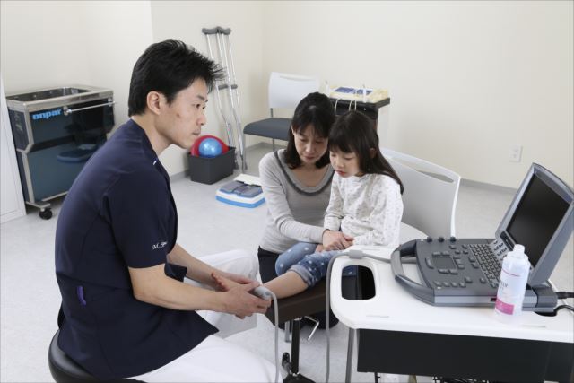 当院では、骨折や捻挫の程度を判断するため、エコー検査をしております。放射線のような被爆の心配がなく、骨折以外の軟部組織損傷もその場で判断できるため、診察には欠かせない機械です。損傷部の癒合状況や安定性なども画像で評価できます。